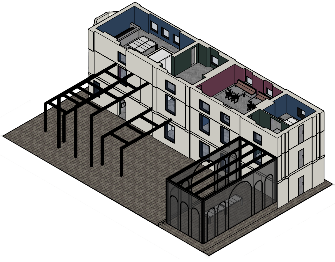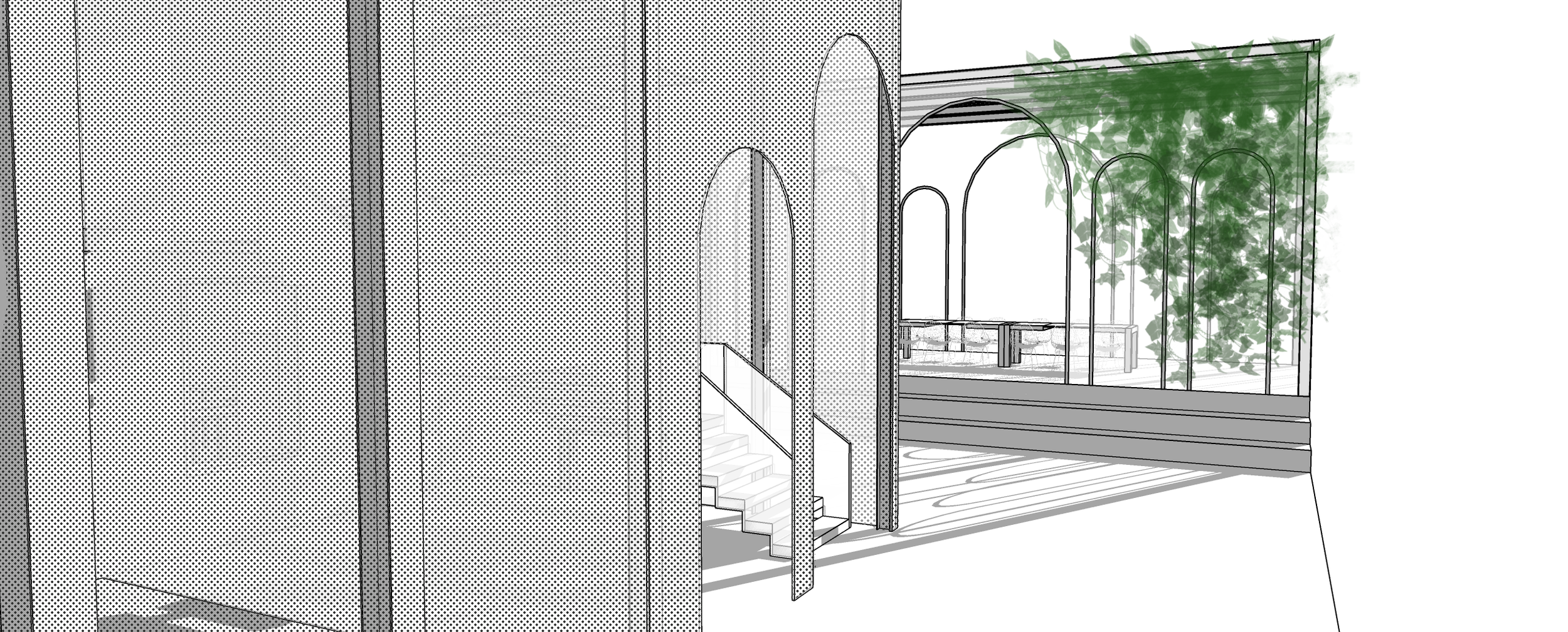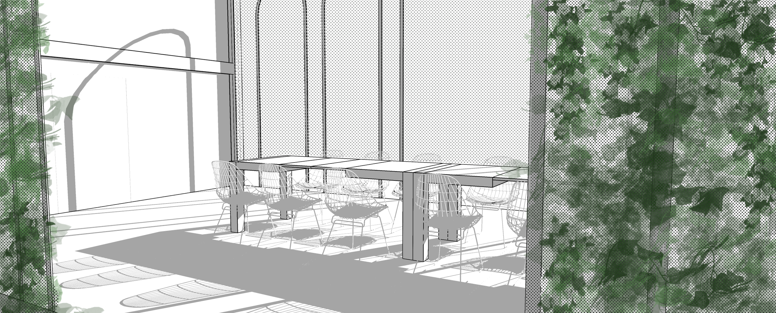 I created a fine dining restaurant with to open rooms and the rest private spaces that could be booked out, the outdoor dining was covered by a structure made of I-beams and steel mesh. This was developed and inspired by the Victorian Crystal Palace, but with an industrial and less delicate take than the original.