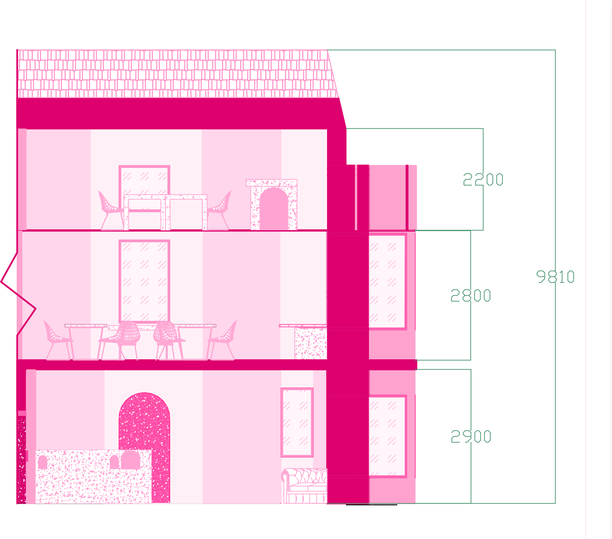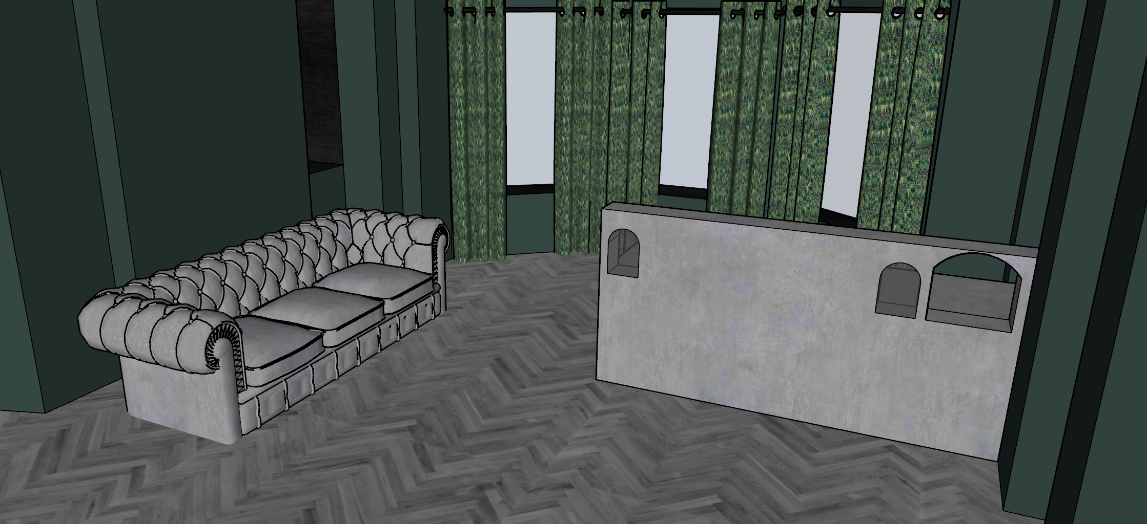 For the interior style I mixed brutalism with very opulent Victorians wallpapers and upholstery for a harsh contrast but I think it allowed for an interest on the outside and to appreciate the detail in my pattern choices.